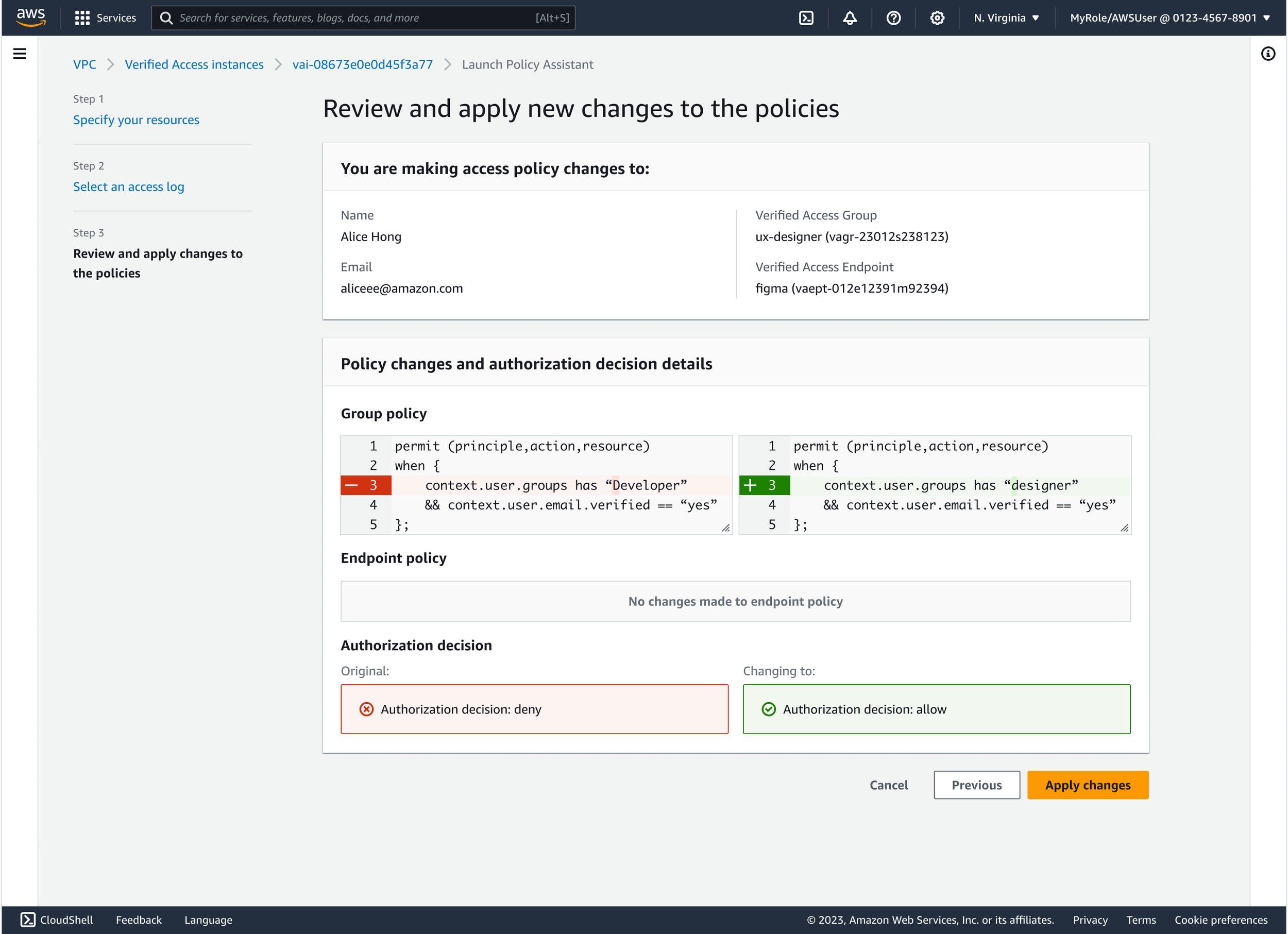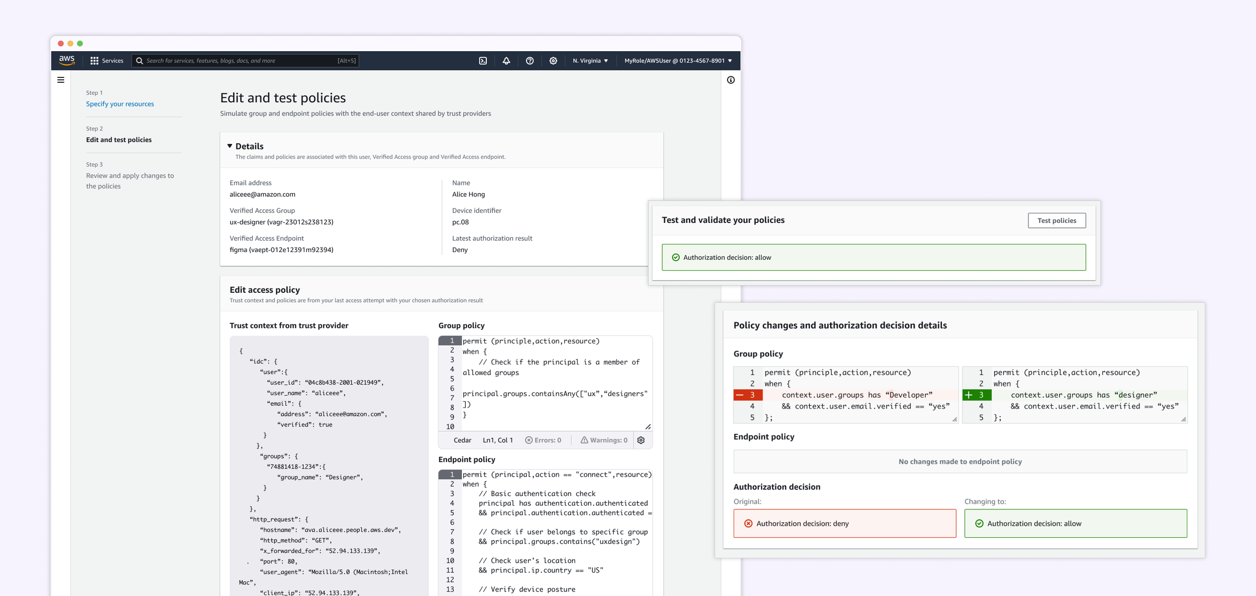 Admins had no way to test their Verified Access policies before saving them. Cedar policy logic—especially when combined with various trust providers—was difficult to visualize or validate, leading to broken access, failed deployments, and reliance on trial-and-error debugging.