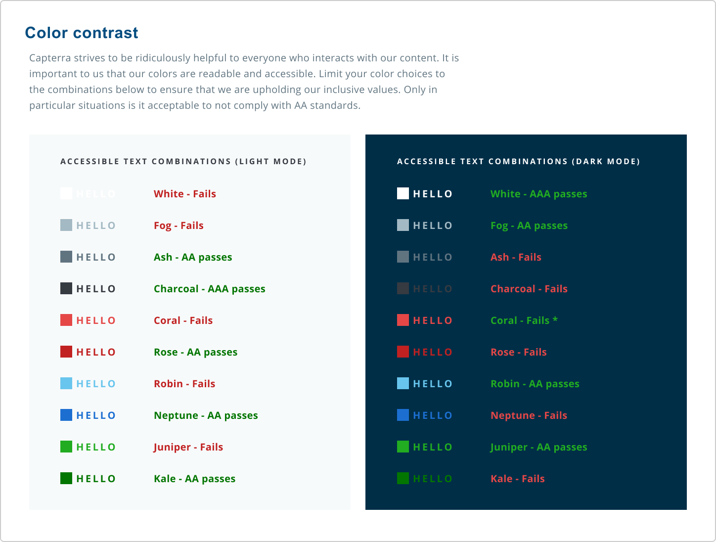 For context, we didn’t have a lot of colors on our site because only one of our brand colors (outside of colors designated for text) was color contrast compliant. In addition to the brand palette, we created an extended color palette for UI use. It was especially important that everything we introduced to the new design system was accessible and user friendly.