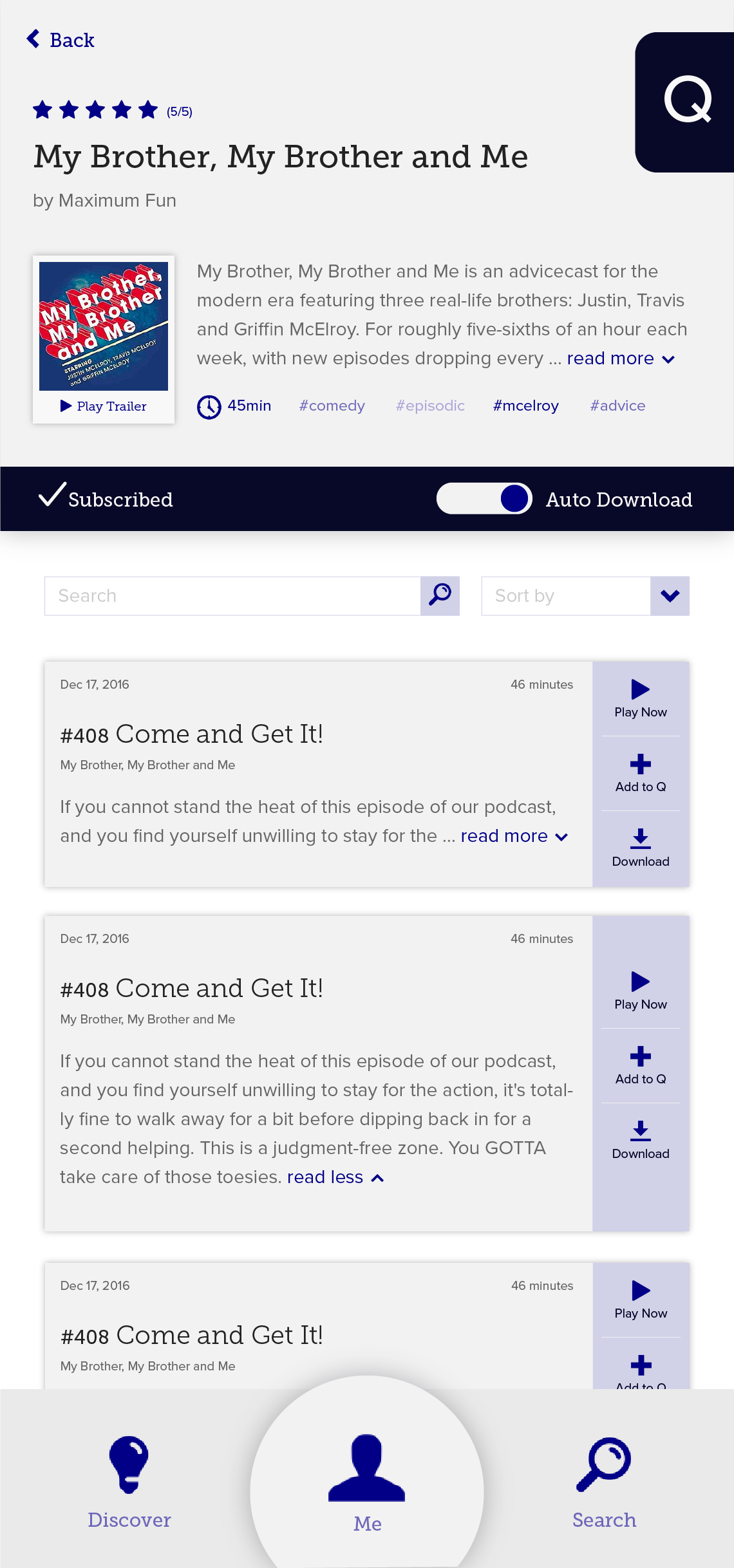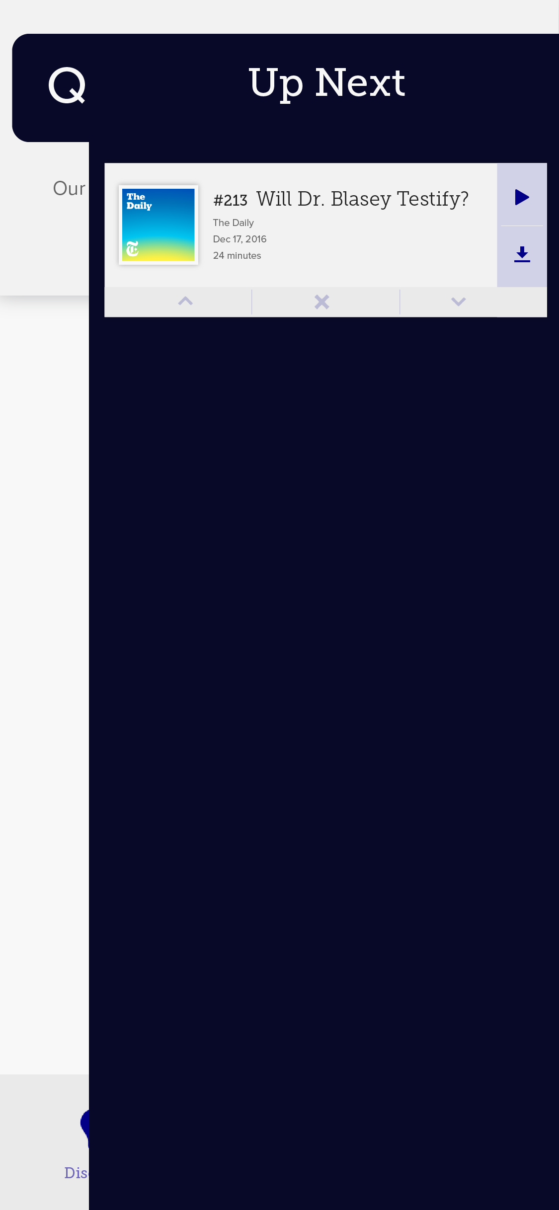 We designed this feature called “daily roulette” that was inspired by dating apps. The feature would play short snippets/trailers of random podcasts and our users would have the chance to swipe left to skip and right to add to their queue. In order to provide more context to the podcast, we also displayed various tags underneath the podcast title.